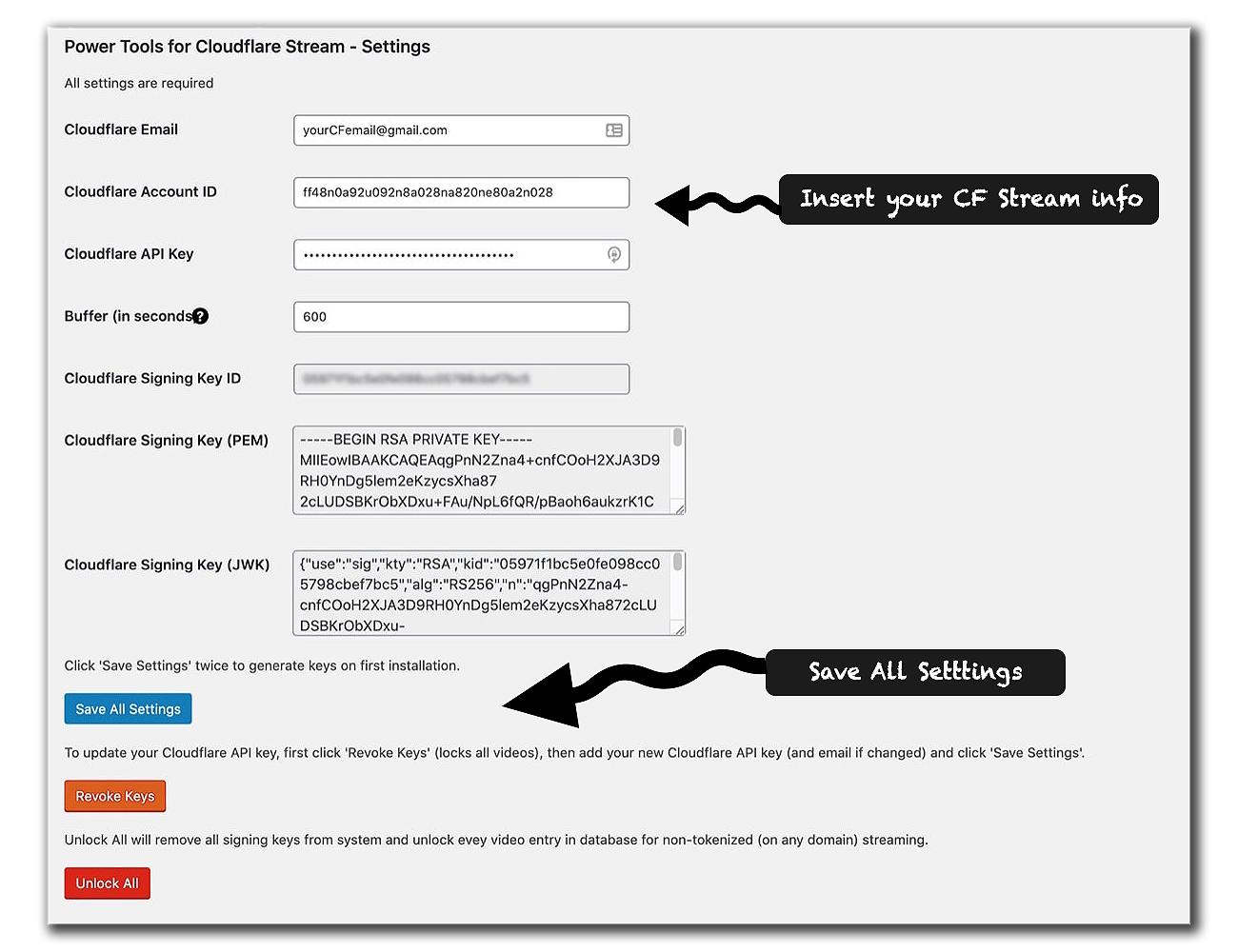 Then insert Cloudflare information again and click on “save all settings”.